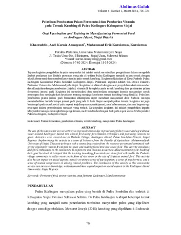 Khaeruddin, Khaeruddin and Andi, Kurnia Armayanti and Muhammad, Erik Kurniawan and Kurniawan, Kurniawan (2024) Pelatihan pembuatan pakan fermentasi dan pemberian vitamin pada ternak kambing di Pulau Kodingare Kabupaten Sinjai. Abdimas Galuh: Jurnal Pengabdian Kepada Masyarakat, 6 (1): 78. pp. 716-724. ISSN 2716-0211