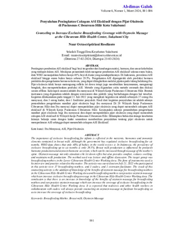 Nuur, Octascriptiriani Rosdianto (2024) Penyuluhan peningkatan cakupan ASI eksklusif dengan pijat oksitosin di Puskesmas Cibeureum Hilir Kota Sukabumi. Abdimas Galuh: Jurnal Pengabdian Kepada Masyarakat, 6 (1): 87. pp. 801-806. ISSN 2716-0211