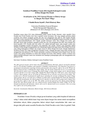 Pemilihan umum tahun 2024 akan dilaksanakan dalam bentuk Pemilu Serentak, yakni memilih Calon Presiden dan Wakil Presiden dan Calon Legislatif secara bersamaan. Hal yang menjadi perhatian adalah sosialisasi dan edukasi mengenai pemilu dan tata cara penggunaan hak pilih di TPS kepada Pemilih Kelompok Lansia yang ada di Desa Dangin Puri Kauh. Tujuan dari Pengabdian Kepada Masyrakat ini adalah untuk mensosialiasaikanPemilu 2024 kepada pemilih kelompok lansia Desa Dangin Puri Kauh, agar kelompok lansia dapat teredukasi mengenai pemilu dan tata cara penggunaan hak pilih. Desa Dangin Puri Kauh memiliki 5.502 Pemilih aktif dan sekitar 12% adalah kelompok lansia yang menjadi sasaran dari kegiatan Pengabdian Kepada Masyarakat yang dilakukan oleh penulis, Metode yang digunakan adalah Sosialiasi Formal dengan mengumpulkan atau mendatangi kegiatan kelompok lansia Desa Dangin Puri Kauh yang sedang berkegiatan di Banjar atau tempat umum di sekitar Dangin Puri Kauh. Dengan diadakannya Sosialisasi Pemilu 2024 dapat mengedukasi kelompok lansia, sehingga kelompok lansia dapat terbantu saat menggunakan hak pilihnya di TPS. Penulis melakukan sosialisasi di kelompok lansia Banjar Pucak Sari dan Lansia yang sedang beraktifitas di sekitar Desa Dangin Puri Kauh. Pada akhirnya melalui sosialiasai dan edukasi pemilih kelompok lansia bisa teredukasi dan mendapat pendampingan pada saat menggunakan hak pilihnya di TPS.Kata kunci: Sosialisasi, Edukasi, Kelompok Lansia, Pemilihan Umum ABSTRACTThe 2024 general election will be held in the form of Simultaneous Elections, namely electing Presidential and Vice Presidential Candidates and Legislative Candidates simultaneously. The thing that is of concern is socialization and education regarding elections and procedures for using the right to vote at the TPS for the Elderly Group of Voters in Dangin Puri Kauh Village. The aim of this Community Service is to socialize the 2024 Election to elderly voters in Dangin Puri Kauh Village, so that elderly groups can be educated about elections and how to use their voting rights. Dangin Puri Kauh Village has 5,502 active voters and around 12% are elderly groups who are the target of Community Service activities carried out by the author. The method used is Formal Socialization by gathering or attending the activities of Dangin Puri Kauh Village elderly groups who are currently active in Banjar or public places around Dangin Puri Kauh. By holding the 2024 Election Socialization, the elderly group can be educated, so that the elderly group can be helped when exercising their right to vote at the TPS. The author carried out outreach to the elderly group of Banjar Pucak Sari and elderly people who were doing activities around Dangin Puri Kauh Village. In the end, through socialization and education, elderly voters can be educated and receive assistance when exercising their right to vote at the polling station.