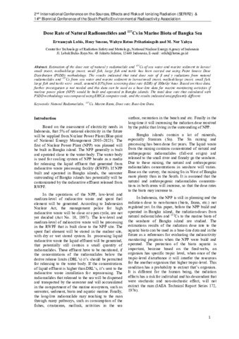 Erwansyah, Lubis and Heny, Suseno and Wahyu Retno, Prihatiningsih and Muhammad, Nuryahya (2016) Dose Rate of Natural Radionuclides and 137Cs in Marine Biota of Bangka Sea. Proceeding of 2nd International Conference on SERIR and 14th SPERA, 2. pp. 1-6. ISSN 978-602-70092-0-2