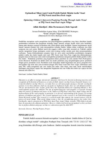 Alfiah, Khodijah and Rika, Purnamasari and Dede, Supendi (2024) Optimalisasi minat anak untuk praktik ibadah melalui audio visual di TPQ Nurul Amal Desa Pasir Angin. Abdimas Galuh: Jurnal Pengabdian Kepada Masyarakat, 6 (1): 94. pp. 857-864. ISSN 2716-0211
