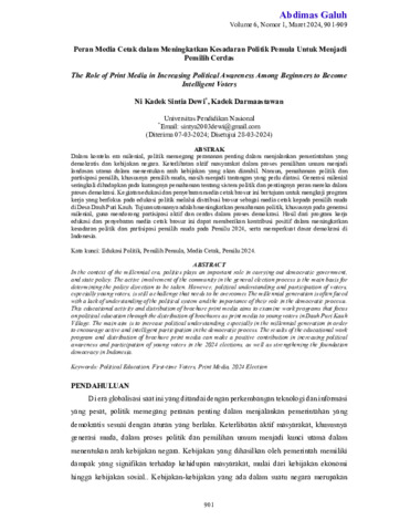 Ni, Kadek Sintia Dewi and Kadek, Darmaastawan (2024) Peran media cetak dalam meningkatkan kesadaran politik pemula untuk menjadi pemilih cerdas. Abdimas Galuh: Jurnal Pengabdian Kepada Masyarakat, 6 (1): 99. pp. 901-909. ISSN 2716-0211