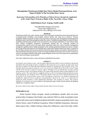 Eka, Purna Yudha and Enjang, Enjang and Taufik, Luthfi (2024) Meningkatkan pemahaman kaidah ilmu nahwu melalui penerapan rumus Arab pegon di Majlis Ta’lim Nurul Ilmi Desa Ciracas. Abdimas Galuh: Jurnal Pengabdian Kepada Masyarakat, 6 (1): 102. pp. 933-942. ISSN 2716-0211