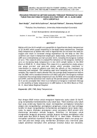 Dewi, Modjo and Andi, Akifa Sudirman and Muriyati, Rokhani and Stevanny, Polontalo (2024) Pengaruh perawatan metode kanguru terhadap peningkatan suhu tubuh pada bayi BBLR di Ruang Nicu RSUD Prof. DR. H. Aloei Saboe Kota Gorontalo. MAHESA: Malahayati Health Student Journal, 4 (4): 4. pp. 1238-1246. ISSN 2746-198X