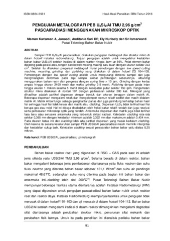 Kartaman Ajiriyanto, Maman and Junaedi, Junaedi and Sari Dei Putri, Anditania and Nurlaily, Ely and Ismarwanti, Sri (2017) PENGUJIAN METALOGRAFI PEB U3Si2/Al TMU 2,96 g/cm3 PASCAIRADIASI MENGGUNAKAN MIKROSKOP OPTIK. Prosiding Seminar Hasil-hasil Penelitian EBN Tahun 2016, - (-). pp. 91-99. ISSN 0854-5561