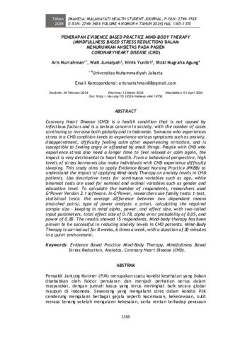 Aris, Nurrahman and Wati, Jumaiyah and Ninik, Yunitri and Rizki, Nugraha Agung (2024) Penerapan evidence based practice mind-body therapy (mindfullness based stress reduction) dalam menurunkan ansietas pada pasien Coronary Heart Disease (CHD). MAHESA: Malahayati Health Student Journal, 4 (4): 15. pp. 1365-1378. ISSN 2746-198X
