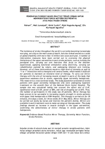Rohani, Rohani and Wati, Jumaiyah and Ninik, Yunitri and Rizki, Nugraha Agung and Elis, Nurhayati Agustina (2024) Penerapan evidence based practice terapi cermin untuk meningkatkan fungsi motorik ekstremitas atas pada pasien stroke. MAHESA: Malahayati Health Student Journal, 4 (4): 20. pp. 1424-1436. ISSN 2746-198X