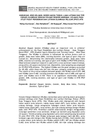 Wahyu, Kurniawan and Dian, Rahadianti and Siti, Ruqayyah and Risky, Irawan Putra Priono (2024) Hubungan jenis kelamin, indeks massa tubuh, lama latihan dan tipe cabang olahraga dengan volume oksigen maksimal (VO₂MAX) pada atlet Pusat Pendidikan dan Latihan Olahraga Pelajar (PPLP) NTB. MAHESA: Malahayati Health Student Journal, 4 (4): 28. pp. 1523-1535. ISSN 2746-198X