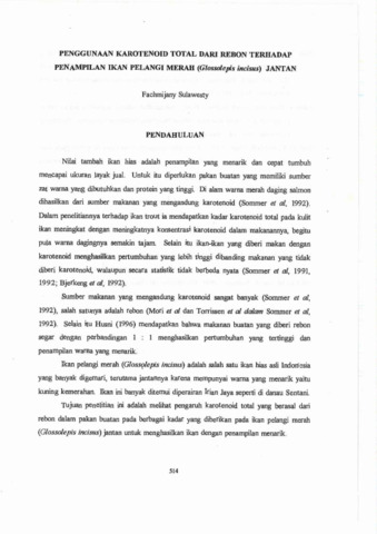 Fachmijany, Sulawesty (1998) Penggunaan karotenoid total dari rebon terhadap penampilan ikan pelangi merah (Glossolepis incisus) jantan. Technical Report. Pusat Penelitian Limnologi, Bogor.