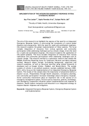 Ayu Fina Lestari, Pebrianti and Septo Pawelas Arso, Shalahuddin and Sutopo Patria Jati, Eriyani (2024) Implementation of the integrated emergency response system: Systematic review. MAHESA: Malahayati Health Student Journal, 4 (4): 33. pp. 1598-1613. ISSN 2746-198X
