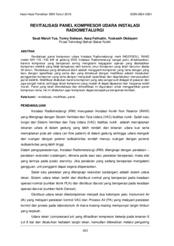 Maruli Tua, Saud and Siahaan, Tonny and Fathudin, Asep and Okdayani, Yoskasih (2017) REVITALISASI PANEL KOMPRESOR UDARA INSTALASI RADIOMETALURGI. Prosiding Seminar Hasil-hasil Penelitian EBN Tahun 2016, - (-). pp. 192-204. ISSN 0854-5561