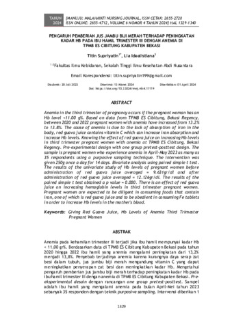 Titin, Supriyatin and Lia, Idealistiana (2024) Pengaruh pemberian jus jambu biji merah terhadap peningkatan kadar Hb pada ibu hamil trimester III dengan anemia di TPMB ES Cibitung Kabupaten Bekasi. Manuju : Malahayati Nursing Journal, 6 (4): 4. pp. 1329-1340. ISSN 2655-2728