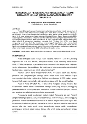 Wahyunigsih, Sri and Charleni P., Arnik and Farida, Farida (2017) PENGENDALIAN PERLENGKAPAN KESELAMATAN RADIASI DAN AKSES KELUAR MASUK LABORATORIUM DI IEBE TAHUN 2016. Prosiding Seminar Hasil-hasil Penelitian EBN Tahun 2016, - (-). pp. 239-247. ISSN 0854-5561