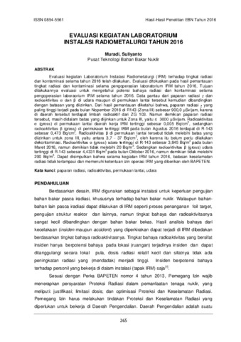 Muradi, Muradi and Suliyanto, Suliyanto (2017) EVALUASI KEGIATAN LABORATORIUM INSTALASI RADIOMETALURGI TAHUN 2016. Prosiding Seminar Hasil-hasil Penelitian EBN Tahun 2016, - (-). pp. 265-272. ISSN 0854-5561