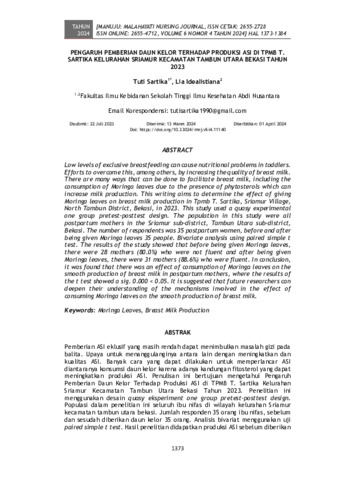 Tuti, Sartika and Lia, Idealistiana (2024) Pengaruh pemberian daun kelor terhadap produksi ASI di TPMB T. Sartika Kelurahan Sriamur Kecamatan Tambun Utara Bekasi tahun 2023. Manuju : Malahayati Nursing Journal, 6 (4): 7. pp. 1373-1384. ISSN 2655-2728