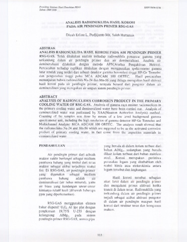ANALISIS RADIONUKLIDAHASIL KOROSI PADA AIR PENDING IN PRIMER RSG-GAS. Telah dilakukan analisis terhadap radionuklida pemancar gamma yang terkandung dalam air pendingin primer dan air demineralisasi. Analisis air demineralisasi dilakukan dengan metode APN(Analisa Pengaktivan Netron). Pencacahan terhadap cuplikan dilakukan dengan menggunakan spektrometer gamma latar rendah yang terdiri dari sebuah detektor gamma beresolusi tinggi HP-Ge Tennelec dan penganalisis tinggi pulsa MCA ADCAM 100 ORTEC. Hasil pencacahan menunjukan bahwa radionuklida Na-24 dan Mn-56 yang diduga merupakan basil aktivasi basil korosi pacta air pendingin primer, ternyata berasal dari pengotor dalam air demineralisasi yang merupakan air umpan sistem pendingin primer.