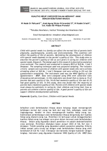 Ni, Made Sri Rahyanti and Anak, Agung Wulan Krisnandari D and Ni, Kadek Sriasih and Gst., Kade Adi Widyas Pranata (2024) Kualitas hidup caregiver dalam merawat anak dengan kebutuhan khusus. Manuju : Malahayati Nursing Journal, 6 (4): 26. pp. 1597-1610. ISSN 2655-2728