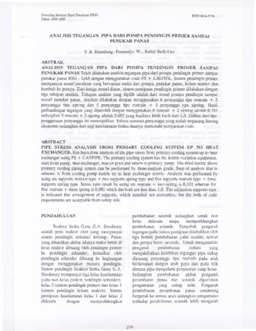 ANALISIS TEGANGAN PIPA DARI POMPA PENDING IN PRIMER SAMPAI PENUKAR PANASTelah dilakukananalisisteganganpipa dari pompa pendingin primer sampai penukar panas RSG- GASdenganmenggunakancode PS + CAEPIPE. Sistempendinginprimer mempunyainosselperalatanyang bervariasi mulaidari pompa, penukar panas, kolam reaktor dID kembali ke pompa. Dari ketiganosseldiatas, sistem pemipaanpendinginprimer dilakukandengan tiga tahapan analisis. Tahapan analisis yang dipilih adalah dari nossel pompa pendingin sampai nossel penukar panas. Analisis dilakukan dengan menggunakan 6 penyangga tire restrain + 2 penyangga tire sipring dan 5 penyangga tire restrain + 3 penyangga tire sipring. Hasil perbandingan teganganyang diperolehdengan menggunakan 6 restrain + 2 sipring adalah 0,101 sedangkan5 restrain + 3 sipringadalah 0,092 yang hasilnyalebih kedl dari 1,0. Dilihatdari tire penggunaan penyanggaini menunjukkan bahwa susunanpenyangga yang sudah terpasang kurang ekonomissedangkandari segikeselamatankedua-duanyamemenuhipersyaratancode.