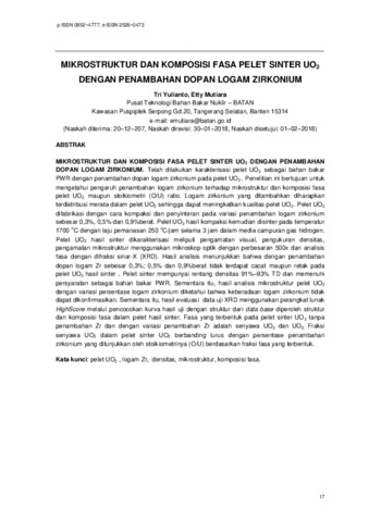 Yulianto, Tri and Mutiara, Etty (2018) MIKROSTRUKTUR DAN KOMPOSISI FASA PELET SINTER UO2 DENGAN PENAMBAHAN DOPAN LOGAM ZIRKONIUM. Jurnal URANIA, 24 (1). pp. 17-26. ISSN p ISSN 0852−4777; e ISSN 2528−0473
