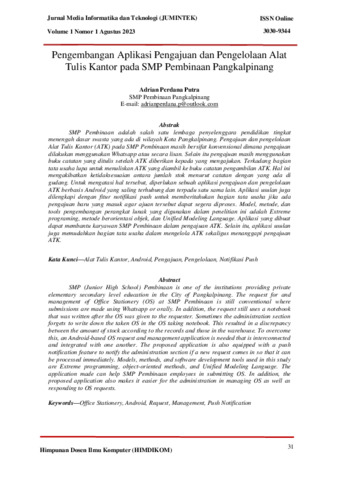 SMP Pembinaan adalah salah satu lembaga penyelenggara pendidikan tingkat menengah dasar swasta yang ada di wilayah Kota Pangkalpinang. Pengajuan dan pengelolaan Alat Tulis Kantor (ATK) pada SMP Pembinaan masih bersifat konvensional dimana pengajuan dilakukan menggunakan Whatsapp atau secara lisan. Selain itu pengajuan masih menggunakan buku catatan yang ditulis setelah ATK diberikan kepada yang mengajukan. Terkadang bagian tata usaha lupa untuk menuliskan ATK yang diambil ke buku catatan pengambilan ATK. Hal ini mengakibatkan ketidaksesuaian antara jumlah stok menurut catatan dengan yang ada di gudang. Untuk mengatasi hal tersebut, diperlukan sebuah aplikasi pengajuan dan pengelolaan ATK berbasis Android yang saling terhubung dan terpadu satu sama lain. Aplikasi usulan juga dilengkapi dengan fitur notifikasi push untuk memberitahukan bagian tata usaha jika ada pengajuan baru yang masuk agar ajuan tersebut dapat segera diproses. Model, metode, dan tools pengembangan perangkat lunak yang digunakan dalam penelitian ini adalah Extreme programing, metode berorientasi objek, dan Unified Modeling Language. Aplikasi yang dibuat dapat membantu karyawan SMP Pembinaan dalam pengajuan ATK. Selain itu, aplikasi usulan juga memudahkan bagian tata usaha dalam mengelola ATK sekaligus menanggapi pengajuan ATK