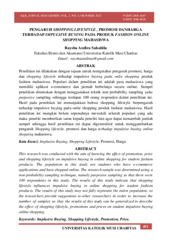 Raysha, Andira Salsabila (2023) Pengaruh shopping lifestyle, promosi dan harga terhadap impulsive buying pada produk fashion online shopping mahasiswa. Konsumen & Konsumsi: Jurnal Manajemen, 2 (3): 1. pp. 451-470. ISSN 2808-4667