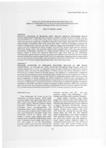 Treaty on the Non Proliferation of Nuclear Weapons (INFCIRC/283). Reaktor Serba Guna GA Siwabessy (RSG-GAS) sebagai reaktor riset merupakan fasilitas nuklir pengelola bahan nuklir yang secara langsung berkewajiban melaksanakan komitmen ini. Tujuan penulisan makalah untuk menguraikan pelaksanaan kegiatan seifgard di reaktor riset RSG-GAS dalam kurun waktu tahun 2006 s.d 2012. Pembahasan difokuskan pada kegiatan inspeksi verifikasi yang secara rutin dilakukan oleh BAPETEN dan IAEA sebagai parameter keberhasilan kegiatan seifgard di RSG-GAS. Dari pembahasan disimpulkan bahwa sampai dengan saat ini tidak ditemukan penyimpangan dalam pemanfaatan bahan nuklir di RSG-GAS, serta menunjukkan komitmen BATAN dalam menjamin pemanfaatan bahan nuklir untuk tujuan damai.