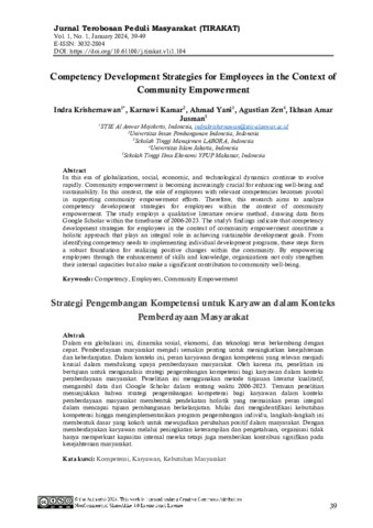 Indra, Krishernawan and Karnawi, Kamar and Ahmad, yani and Agustin, Zen and Ikhsan, Amar Jusman (2024) Competency development strategies for employees in the context of community empowerment. Jurnal Terobosan Peduli Masyarakat, 1 (1): 5. pp. 39-49. ISSN 3032-2804