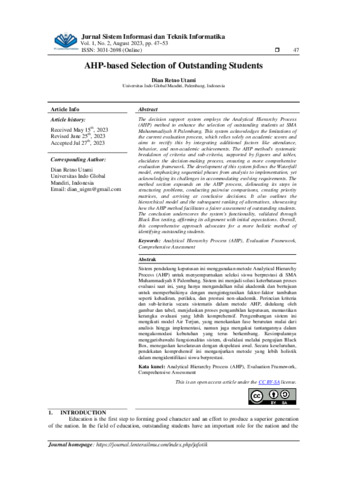 Dian, Retno Utami (2023) AHP-based selection of outstanding students. Jurnal Sistem Informasi dan Teknik Informatika, 1 (2): 2. pp. 47-53. ISSN 3031-2698