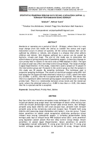 Selpiyah, Selpiyah and Mahyar, Suara (2024) Efektivitas pemberian rebusan kayu secang (Caesalpenia Sappan L.) terhadap penyembuhan biang keringat. Manuju : Malahayati Nursing Journal, 6 (2). pp. 569-577. ISSN 2655-2728