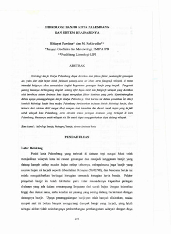 Hidrologi banjir Kodya Palembang dapat dicirikan dari faktor-faktor pembangkit genangan air, yaitu dari sifat hujan lokal, fluktuasi pasang-surut air Musi, serta fisiografi wilayah, di mana interaksi ketiganya akan menentukan tingkat kegawatan genangan banjir yang terjadi. Pengaruh pasang biasanya berlangsung singkat, sedang sifat hujan lokal dan fisiografi wilayah yang dicirikan oleh buruknya sistem drainase kota dapat merupakan faktor dominan yang perlu di pertimbangkan dalam upaya penanggulangan banjir Kodya Palembang. Oleh karena ini dalam penelitian ini dikaji kembali hidrologi banjir kota madya Palembang berdasarkan tinjauan ilmiah hidrologi banjir, data historis dari catatan debit sungai Musi maupun dari intensitas dan durasi curah hujan yang terjadi untuk wilayah kota Palembang, serta ciri-ciri sistem jaringan drainase yang terdapat di kota Palembang, khususnya untuk wilayah sisi Ilir untuk dapat menggambarkan daya dukung wilayah.