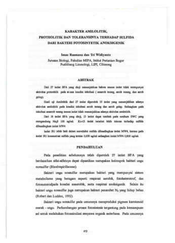 Iman, Rusmana and Tri, Widiyanto (1998) Karakter amilolitik, proteolitik dan toleransinya terhadap sulfida dari bakteri fotosintetik anoksigenik. Technical Report. Pusat Penelitian Limnologi, Bogor.