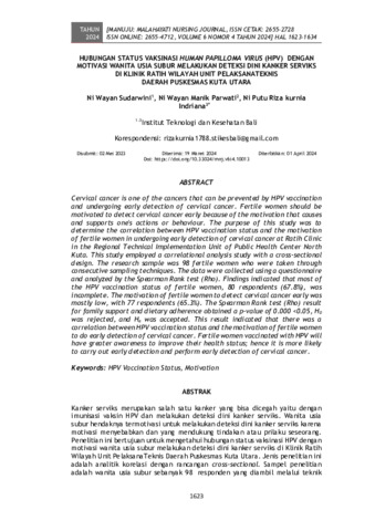 Ni, Wayan Sudarwini and Ni, Wayan Manik Parwati and Ni, Putu Riza kurnia Indriana (2024) Hubungan status vaksinasi Human Papilloma Virus (HPV) dengan motivasi wanita usia subur melakukan deteksi dini kanker serviks di Klinik Ratih Wilayah Unit Pelaksana Teknis Daerah Puskesmas Kuta Utara. Manuju : Malahayati Nursing Journal, 6 (4): 28. pp. 1623-1634. ISSN 2655-2728