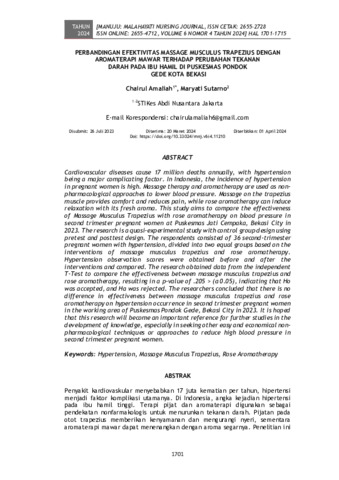 Chairul, Amaliah and Maryati, Sutarno (2024) Perbandingan efektivitas massage musculus trapezius dengan aromaterapi mawar terhadap perubahan tekanan darah pada ibu hamil dI Puskesmas Pondok Gede Kota Bekasi. Manuju : Malahayati Nursing Journal, 6 (4): 34. pp. 1701-1715. ISSN 2655-2728