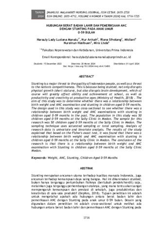 Harauly, Lady Lusiana Manalu and Nur, Anisah and Riana, Sihotang and Misliani, Nurainun Hasibuan and Mira, Lisda (2024) Hubungan berat badan lahir dan pemeriksaan ANC dengan stunting pada anak umur 0-59 bulan. Manuju : Malahayati Nursing Journal, 6 (4): 35. pp. 1716-1725. ISSN 2655-2728