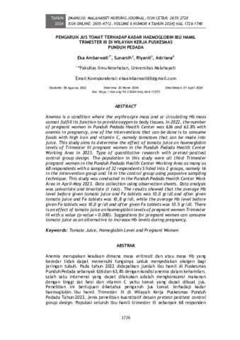 Eka, Ambarwati and Sunarsih, Sunarsih and Riyanti, Riyanti and Astriana, Astriana (2024) Pengaruh jus tomat terhadap kadar haemoglobin ibu hamil trimester iii di Wilayah Kerja Puskesmas Punduh Pedada. Manuju : Malahayati Nursing Journal, 6 (4): 36. pp. 1726-1740. ISSN 2655-2728