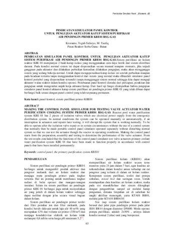 PEMBUATAN SIMULATOR PANEL KONTROL UNTUK PENGUJIAN AKTUATOR KATUP SISTEM PURIFIKASI AIR PENDINGIN PRIMER KBE01 RSG-GAS,Sistem purifikasi air kolam reaktor KBE 01 mempunyai 2 buah katup isolasi yang menggunakan catu daya listrik dari sistem distribusi darurat. Pada kondisi normal sistem ini dapat dioperasikan secara manual maupun otomatis, jika terjadi gangguan pada aktuator dan dilakukan perbaikan kemudian dilakukan pengujian, maka akan mengganggu sistem yang sedang bekerja normal. Untuk dapat mengoperasikan katup isolasi ini setelah perbaikan maupun pada keadaan tertentu tanpa menggunakan kontrol dari sistem yang normal maka dibuatlah simulator panel kontrol portabel yang dioperasikan tersendiri tanpa mengganggu sistem normal sehingga kita dapat menguji aktuator walau reaktor dalam kondisi operasi. Pembuatan panel kontrol dimulai dari persiapan, perakitan dan pengujian untuk mengetahui unjuk kerja aktuator katup. Dari hasil uji fungsi disimpulkan bahwa pengujian simulator panel kontrol aktuator katup sistem purifikasi air pendingin primer KBE 01 yang telah dibuat dapat berfungsi baik sesuai dengan panel control yang telah terpasang permanen.