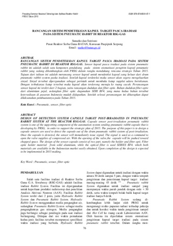 RANCANGAN SISTEM PENDETEKSIAN KAPSUL TARGET PASCA IRADIASI PADA SISTEM PNEUMATIC RABBIT DI REAKTOR RSG-GAS. Sensor kapsul pasca iradiasi pada sistem pneumatic rabbit ini adalah salah satu komponen pendukung pada sistem otomatisasi pengirim kapsul penumatic rabbit yang sedang dikembangkan oleh PRSG dalam rangka mendukung rencana strategis Tahun 2015. Tujuan dari tulisan ini adalah merancang sensor kapsul untuk mendeteksi kapsul yang keluar dari drum pneumatic rabbit system paska iradiasi. Setelah kapsul terdeteksi maka sensor akan segera mengeluarkan sinyal. Sinyal tersebut dipergunakan sebagai perintah untuk membuka katup supplai udara bertekanan. Dengan terbukanya katup tersebut maka kapsul akan terdorong menuju ke ruang cacah. Perancangan sensor kapsul ini terdiri dari 2 bagian, yaitu rancangan dudukan dan fiber optic. Bahan dudukan fiber optic dari aluminium pejal, sedangkan fiber optic dugunakan SERI BF4, yang mana kedua bahan tersebut ketersediaan di pasaran Indonesia mudah didapatkan. Setelah selesai perancangan ini diharapkan dapat dilaksanakan pembuatannya pada Tahun 2015.