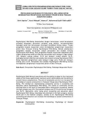 Dwin, Seprian and Nurul, Hidayah and Masmuri, Masmuri and Muhammad, Syafri Fakhruddin (2024) Penyuluhan dan edukasi psychological well-being untuk meningkatkan pengetahuan masyarakat pesisir di Desa Temajuk Kabupaten Sambas. Jurnal Kreativitas Pengabdian kepada Masyarakat, 7 (4): 20. pp. 1644-1653. ISSN 2615-0921