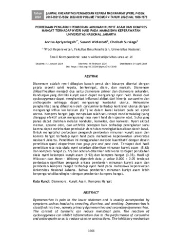 Annisa, Apriyaningsih and Susanti, Widiastuti and Cholisah, Suralaga (2024) Perbedaan pengaruh pemberian minuman kunyit asam dan kompres hangat terhadap nyeri haid pada mahasiswa keperawatan Universitas Nasional Jakarta. Jurnal Kreativitas Pengabdian kepada Masyarakat, 7 (4): 22. pp. 1666-1676. ISSN 2615-0921