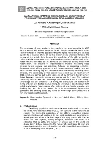 Lusi, Noviyanti and Mutianingsih, Mutianingsih and Iin, Ira Kartika (2024) Manfaat senam hipertensi air rebusan daun salam terhadap penurunan tekanan darah lansia di wilayah PKM Sirnajaya. Jurnal Kreativitas Pengabdian kepada Masyarakat, 7 (4): 27. pp. 1728-1743. ISSN 2615-0921