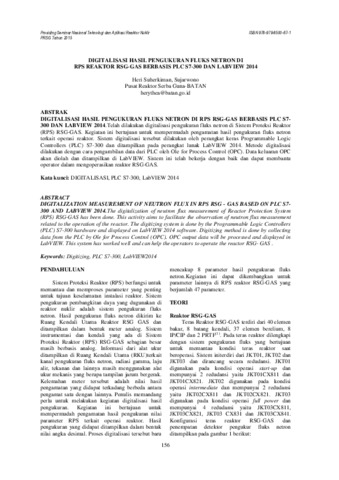 300 DAN LABVIEW 2014.Telah dilakukan digitalisasi pengukuran fluks netron di Sistem Proteksi Reaktor (RPS) RSG-GAS. Kegiatan ini bertujuan untuk mempermudah pengamatan hasil pengukuran fluks netron terkait operasi reaktor. Sistem digitalisasi tersebut dilakukan oleh perangkat keras Programmable Logic Controllers (PLC) S7-300 dan ditampilkan pada perangkat lunak LabVIEW 2014. Metode digitalisasi dilakukan dengan cara pengambilan data dari PLC oleh Ole for Process Control (OPC). Data keluaran OPC akan diolah dan ditampilkan di LabVIEW. Sistem ini telah bekerja dengan baik dan dapat membantu operator dalam mengoperasikan reaktor RSG-GAS.