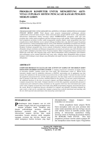 PROGRAM KOMPUTER UNTUK MENGHITUNG AKTIVITAS CUPLIKAN SISTEM PENCACAH KAMAR PENGION MERLIN GERIN. Telah disusun suatu program komputeruntuk perhitungan aktivitas cuplikansistem pencacah kamar pengion. Sistem pencacah kamar pengion Merlin Gerin yang digunakan laboratorium standardisasi bidang metrologi radiasi P3KRBiN-BATAN, merupakan salah satu jenis peralatan ukur radiasi untuk pengukuran aktivitas berbagai macam radio nuklida. Untuk menampilkan data hasil pengukuran peralatan tersebut sudah menggunakan tampilan digital, tetapi pengambilan data hasil pengukurannya masih dilakukan secara manual sehingga ketelitian data yang diperoleh sangat bergantung pada operatornya. Untuk meningkatkan kinerja sistem, telah dilakukan penambahan perangkat keras berupa komputer personal dan Multimeter Digital serta analisis, perancangan dan pembuatan program komputer. Komputer berfungsi pengambil data secara otomatis berdasarkan runtunan perintah yang diberikan dan dilanjutkan dengan melakukan perhitungan menggunakan persamaan-persamaan yang telah ditentukan dan yang terakhir melakukan pencetakan hasil. Program komputer dibuat menggunakan bahasa pemrograman Delphi dan telah diuji coba langsung pada sistem. Hasil perbandingan antara perhitungan oleh komputer dan perhitungan secara manual diperoleh hasil yang sama, sehingga dapat disimpulkan bahwa program komputer telah berfungsi sesuai dengan yang diharapkan dan unjuk kerja dari sistem pencacah telah dapat ditingkatkan.