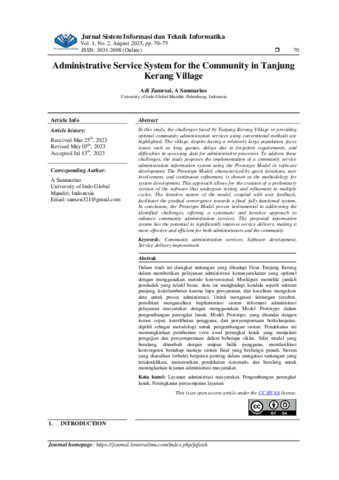 Adi, Zamrozi and A, Sanmarino (2023) Administrative service system for the community in Tanjung Kerang Village. Jurnal Sistem Informasi dan Teknik Informatika, 1 (2): 5. pp. 70-75. ISSN 3031-2698