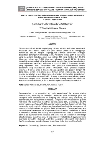 Septiwiyarsi, Septiwiyarsi and Marini, Iskandar and Melti, Suriyah (2024) Penyuluhan tentang senam dismenorea sebagai upaya mengatasi nyeri haid pada remaja puteri di SMAN 1 Pebayuran. Jurnal Kreativitas Pengabdian kepada Masyarakat, 7 (4): 35. pp. 1814-1821. ISSN 2615-0921