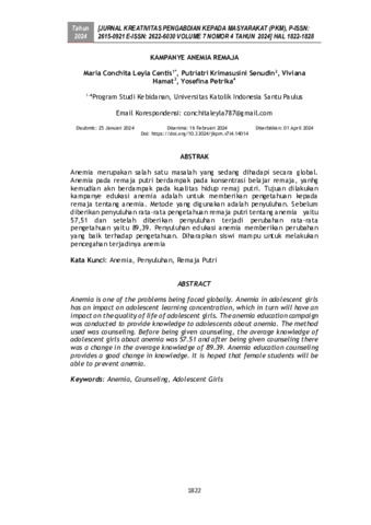 Maria, Conchita Leyla Centis and Putriatri, Krimasusini Senudin and Viviana, Hamat and Yosefina, Petrika (2024) Kampanye anemia remaja. Jurnal Kreativitas Pengabdian kepada Masyarakat, 7 (4): 36. pp. 1822-1828. ISSN 2615-0921