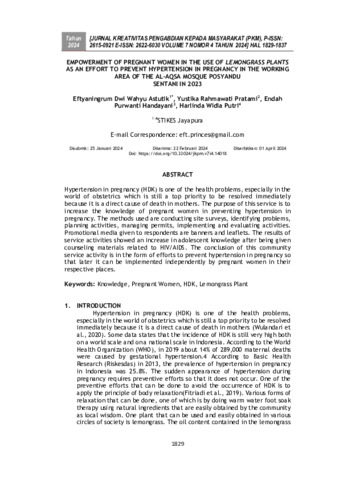 Eftyaningrum, Dwi Wahyu Astutik and Yustika, Rahmawati Pratami and Endah, Purwanti Handayani and Harlinda, Widia Putri (2024) Empowerment of pregnant women in the use of lemongrass plants as an effort to prevent hypertension in pregnancy in the working area of the Al-Aqsa Mosque Posyandu Sentani in 2023. Jurnal Kreativitas Pengabdian kepada Masyarakat, 7 (4): 37. pp. 1829-1837. ISSN 2615-0921
