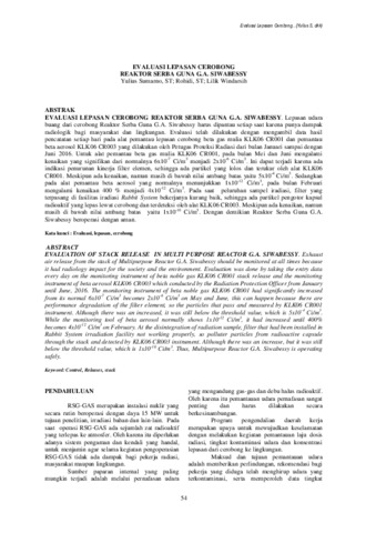 EVALUASI LEPASAN CEROBONG REAKTOR SERBA GUNA G.A. SIWABESSY. Lepasan udara buang dari cerobong Reaktor Serba Guna G.A. Siwabessy harus dipantau setiap saat karena punya dampak radiologik bagi masyarakat dan lingkungan. Evaluasi telah dilakukan dengan mengambil data hasil pencatatan setiap hari pada alat pemantau lepasan cerobong beta gas mulia KLK06 CR001 dan pemantau beta aerosol KLK06 CR003 yang dilakukan oleh Petugas Proteksi Radiasi dari bulan Januari sampai dengan Juni 2016. Untuk alat pemantau beta gas mulia KLK06 CR001, pada bulan Mei dan Juni mengalami kenaikan yang signifikan dari normalnya 6x10-7 Ci/m3 menjadi 2x10-6 Ci/m3. Ini dapat terjadi karena ada indikasi penurunan kinerja filter elemen, sehingga ada partikel yang lolos dan terukur oleh alat KLK06 CR001. Meskipun ada kenaikan, namun masih di bawah nilai ambang batas yaitu 5x10-4 Ci/m3. Sedangkan pada alat pemantau beta aerosol yang normalnya menunjukkan 1x10-12 Ci/m3, pada bulan Februari mengalami kenaikan 400 % menjadi 4x10-12 Ci/m3. Pada saat peluruhan sampel iradiasi, filter yang terpasang di fasilitas iradiasi Rabbit System bekerjanya kurang baik, sehingga ada partikel pengotor kapsul radioaktif yang lepas lewat cerobong dan terdeteksi oleh alat KLK06 CR003. Meskipun ada kenaikan, namun masih di bawah nilai ambang batas yaitu 1x10-10 Ci/m3. Dengan demikian Reaktor Serba Guna G.A. Siwabessy beroperasi dengan aman.