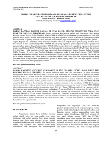 KAJIAN PAPARAN RADIASI GAMMA DI ATAS KANAL HUBUNG PRSG-PSTBM PADA SAAT REAKTOR RSG-GAS BEROPERASI. Untuk menjamin keselamatan radiasi dan lingkungan ,dari adanya kegiatan operasi Reaktor Serba Guna GA. SIWABESSY (RSG-GAS) telah dilakukan pemantauan daerah kerja dari paparan radiasi gamma. Berkas neutron RSG-GAS yang akan digunakan melalui beam tube S-5 yang menyalurkan berkas neutron ke gedung Neutron Guide Hall (PSTBM) ternyata juga menyumbangkan paparan radiasi gamma . Tujuan kegiatan ini dilakukan untuk menentukan bahwa tidak ada tingkat radiasi gamma yang melebihi batas keselamatan di atas kanal hubung PRSG-PSTBM. Metoda yang digunakan yaitu dengan melakukan pengukuran paparan radiasi gamma dengan kondisi reaktor RSG-GAS beroperasi. Dari hasil pengukuran paparan radiasi gamma di atas kanal hubung PRSG-PSTBM terpantau dari beberapa titik pengukuran terkecil 0.29 μSv/ jam dan terbesar 2.23 μSv/ jam , nilai tersebut melebihi batas yang telah dipersyaratkan dari Komisi Proteksi Radiasi Kawasan Nuklir Serpong 0.3 μSv/ jam. Setelah dilakukan perhitungan, maka di atas Kanal Hubung PRSG-PSTBM diperlukan penambahan shielding beton setembal minimal 20 cm, agar persyaratan dapat terpenuhi. Oleh sebab itu perlu adanya kerjasama dari Pusat Reaktor Serba Guna (PRSG) dan Pusat Sains dan Teknologi Bahan Maju (PSTBM) untuk mengendalikan paparan radiasi gamma di kanal hubung PRSG – PSTBM agar paparan radiasi di sekitar Kanal dibawah batas yang dipersyaratkan.