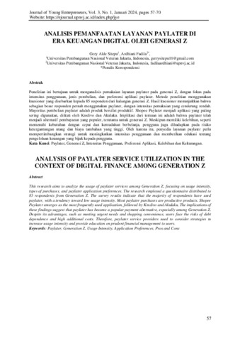 Gery, Alde Sitepu and Ardhiani, Fadila (2024) Analisis pemanfaatan layanan paylater di era keuangan digital oleh generasi z. Journal of Young Entrepreneurs, 3 (1): 5. pp. 57-70. ISSN 2964-8521