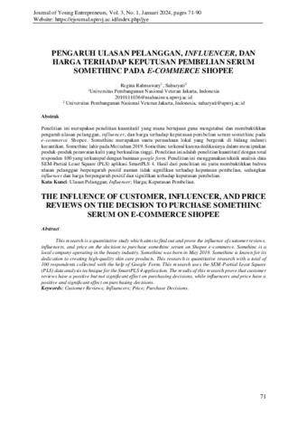 Regina, Rahmawaty and Suharyati, Suharyati (2024) Pengaruh ulasan pelanggan, influencer, dan harga terhadap keputusan pembelian serum somethinc pada e-commerce Shopee. Journal of Young Entrepreneurs, 3 (1): 6. pp. 71-90. ISSN 2964-8521